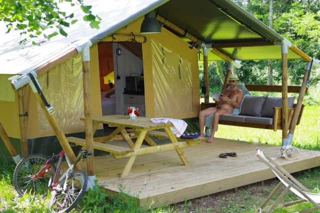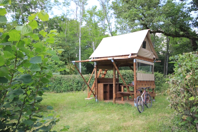 Les 2 lodges Safari, installés en 2021, sont des tentes aménagées de 16m². Sur un plancher en bois avec 2 chambres (1 lit double et 2 lits simples ; draps et serviettes ne sont pas fournis). Cuisine aménagée et terrasse ensoleillée avec table, chaises et transats. Les sanitaires sont ceux du camping.